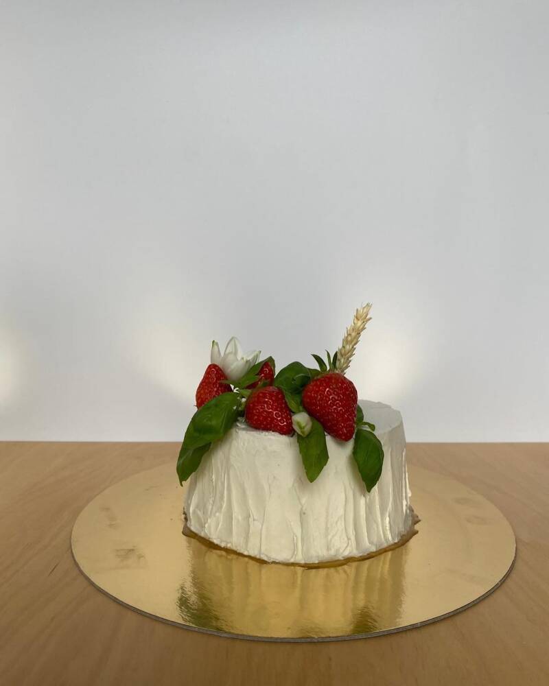 Chaque étage est composé de gâteaux à la vanille avec une crème montée mascarpone vanillée, confiture de fraises et fraises de saison.