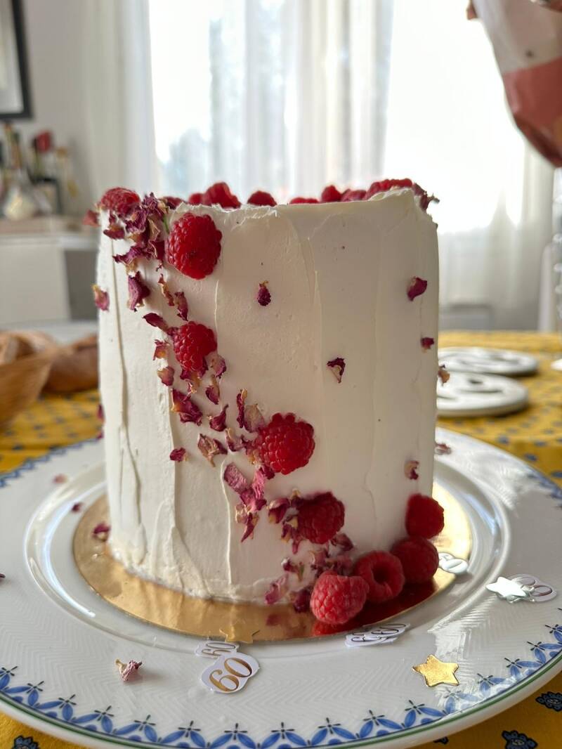 Pour l'occasion un gâteau avec framboises fraîches, confiture de framboise, glaçage meringuée à l'eau de rose et pétales de roses comestibles en décoration.