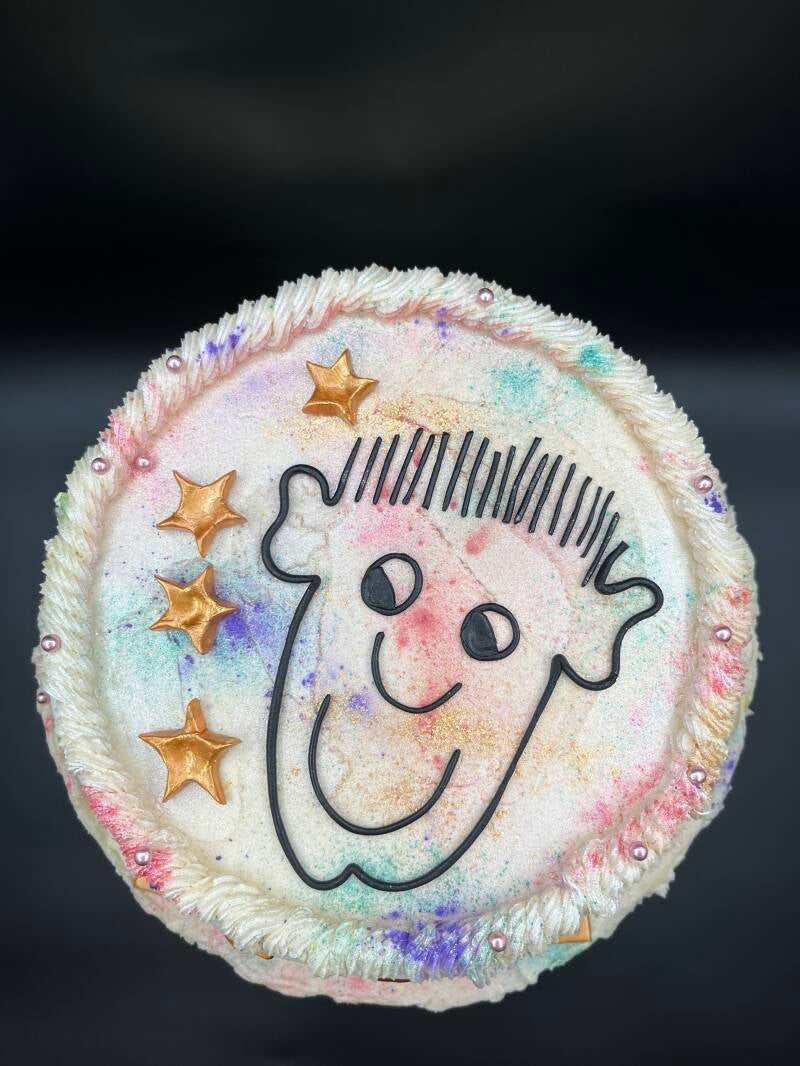 Gâteau au citron avec lemon curd et crémeux meringué. Décors en pâte à sucre et figurines.