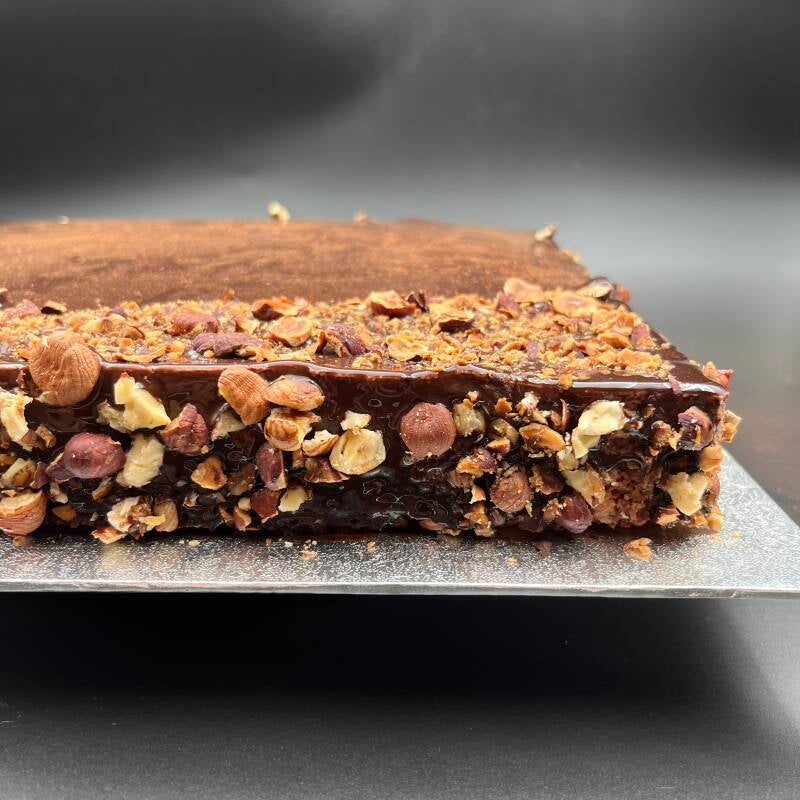 Une dacquoise aux amandes et noisettes pour le biscuit, une feuillantine chocolat lait et praliné maison pour le croquant, surmonté de sa mousse au chocolat noir fondante. Un glaçage miroir et des noisettes torréfiées en décoration.