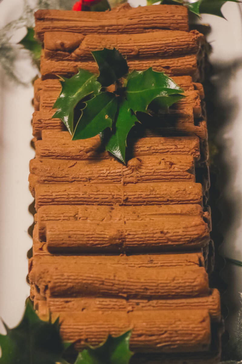 Une bûche impression bûchettes au chocolat avec croustillant et praliné 100% fait maison.